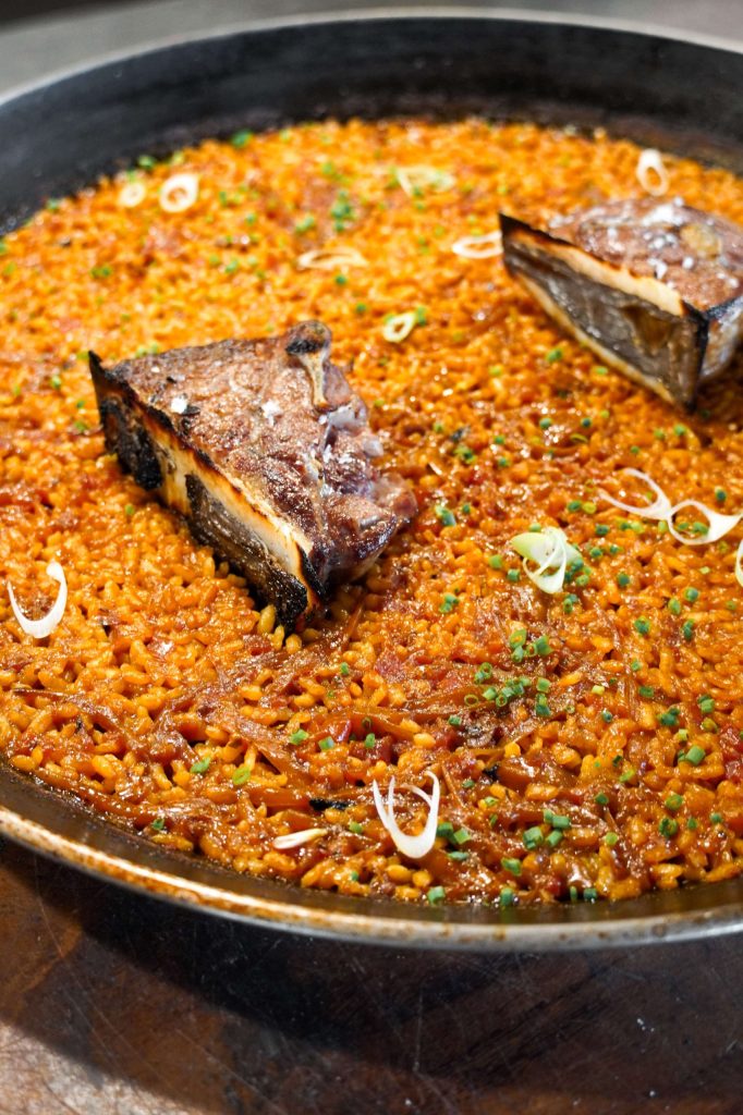 The menu opens with relaxed starters designed to pass around: jamón ibérico croquettes with tomato alioli, and confit artichokes and leeks with Payoyo cheese and romesco. The centrepiece is rice cooked to order, with five choices: Campero, Fish & Seafood, Black, Mixed or Vegetarian. A homemade dessert closes the meal on a sweet note.