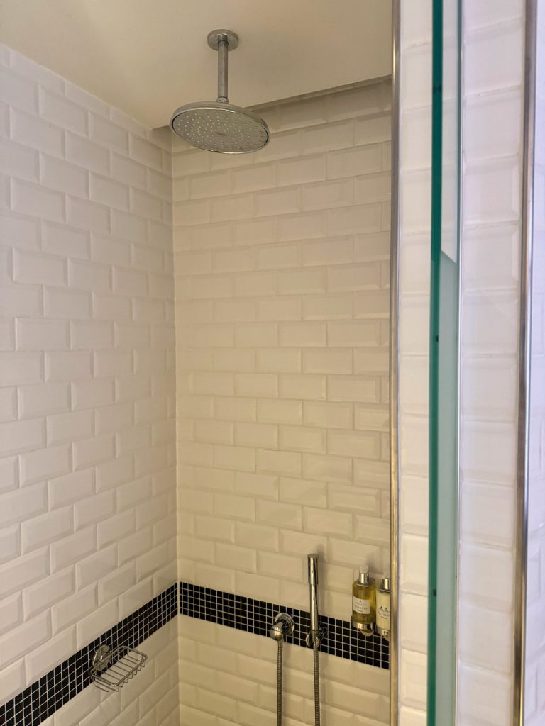 In the bathroom, white metro tiles are laid horizontally and broken up with a dark mosaic tile band. A walk-in rainfall shower sits alongside a full-sized bath, and the vanity comes with twin sinks.