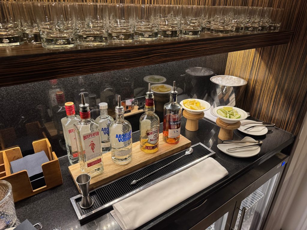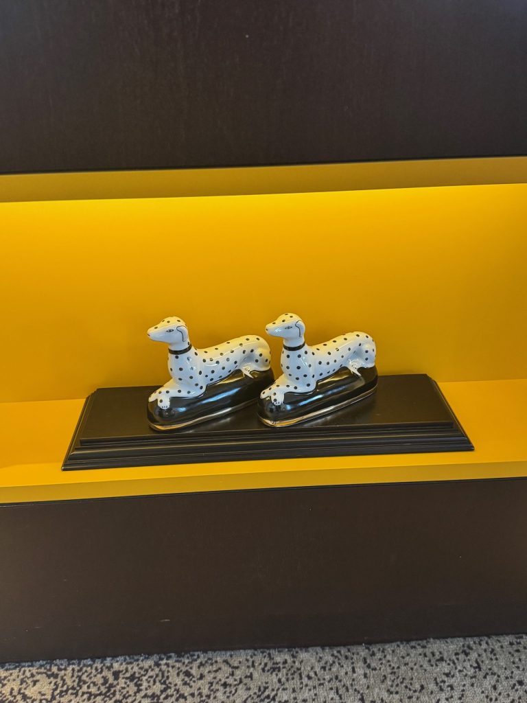 Across from the bed, the space opens into a living area with a coffee table and a further gold-accented pedestal table. Integrated into the cabinetry, the minibar is stocked with premium snacks and drinks, and above a Nespresso machine and kettle sit alongside a coffee and tea selection. The flat screen TV is set flush within a dark wood panel, and below a pair of ceramic dalmatian dogs and orange lighting creates a focal point, almost like that of a fireplace.