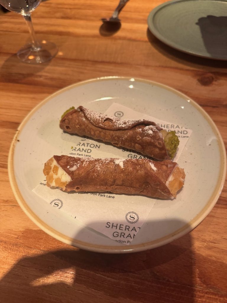 For dessert, a silky tiramisu arrived shaped like a cocoa-dusted coffee bean, and two cannoli were piped to order with pistachio and citrus ricotta fillings.