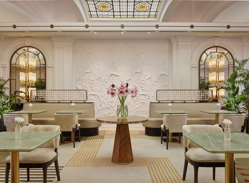 Step inside and you’re immediately struck by the newly reopened Palm Court’s luminous calm (in preparation for the hotel’s centenary in 2027). Look up, and you will see the restored stained‑glass skylights which stretch across the vaulted ceiling, bathing the room in natural light. Clusters of curved sofas and contemporary tub chairs create inviting pockets for conversation and social moments, while green marble tables and brushed chrome in the lounge/bar combine organic richness with industrial sheen. Keep your eye out for the sculpted botanical friezes, which add a new tactile elegance to the side walls. The redesign also takes inspiration from the rhythmic abstractions of Marion Dorn, a textile artist of the early 20th century, with layered patterns in the carpets and textured upholstered stools, which help bridge the hotel’s past to its present.