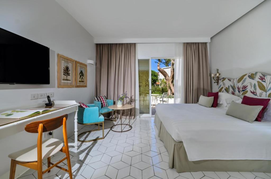 Surrounded by seven beautifully tended acres of land, this 52-bedroom residence is the place to choose for seclusion and private walks. It has an authentic Ischian feel, with local dishes created in the il Corbezzolo restaurant from the freshest island ingredients (many of which originate from the hotel’s organic vegetable garden). An outdoor pool and jacuzzi is fed by the natural thermal waters, as is the spa. Botania Relais & Spa is ideal for older families (children over 12 are welcome) or as a romantic boutique break. Lacco Ameno is just a short stroll away, accessed by a series of stone steps.