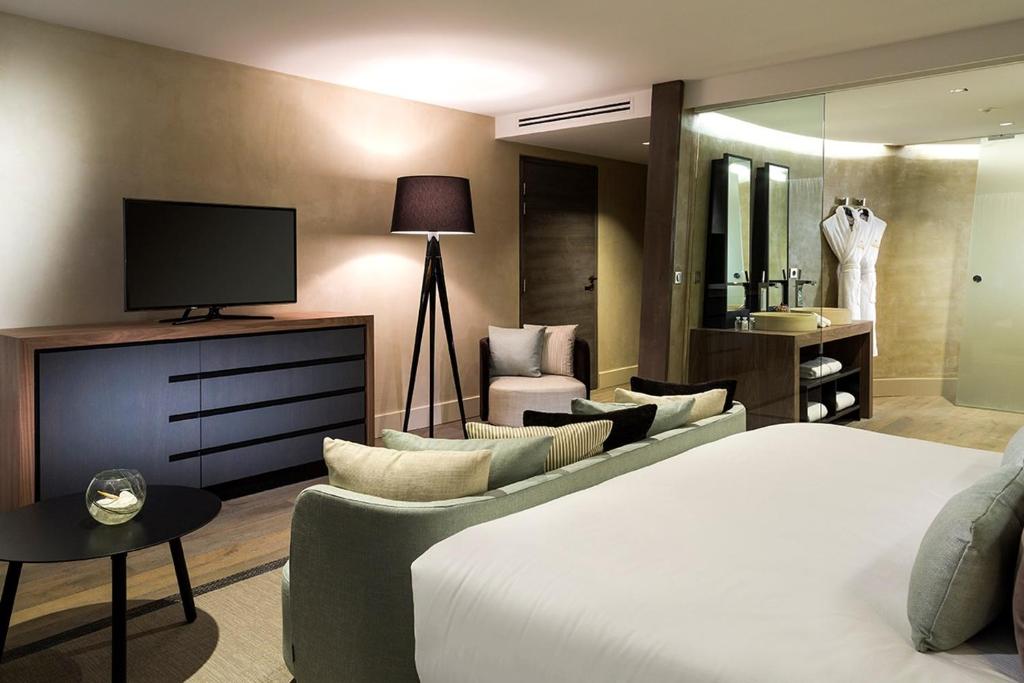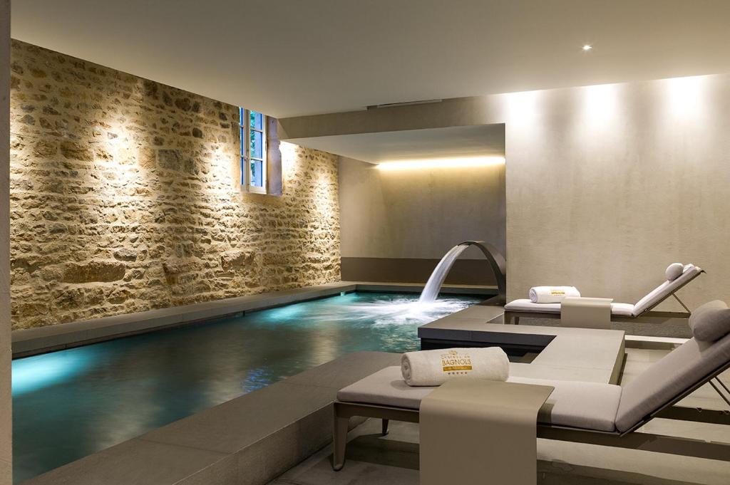 Nestled among the vineyards of Beaujolais, Chateau De Bagnols is  half an hour outside of the centre in a pretty village. Housed in a privately owned 15th-century castle, the hotel offers 27 suites (some air conditioned), across three categories. Contemporary decor in cool tones blends with antiques, four poster beds, vaulted ceilings and beams. The formal restaurant, 1217, is Michelin-starred and features an enormous, majestic, stone carved fireplace, as well as a south-facing al fresco terrace. Or guests can take a seat in the inner courtyard’s Café du Château for lighter meals. Additional deluxe amenities found on site include an outdoor pool flanked by cherry trees, a spa and a gym.