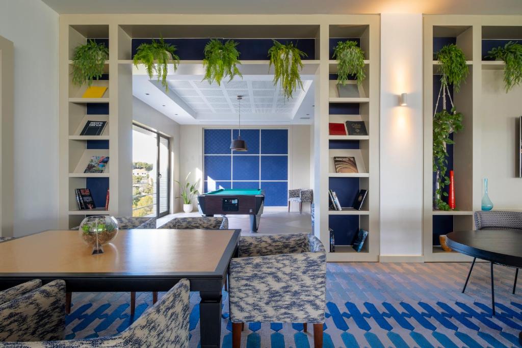 Built in a crescent shape, Eurostar Sitges is an unusual landmark hotel, perched on a hill — the sea on one side, a sweeping golf course on the other. The hotel’s pool area looks out onto the latter, providing an especially sheltered spot to enjoy a swim and sunbathe, on parasol topped loungers, surrounded by palm trees. The design has been inspired by the bordering coast, with 263 rooms in soft colours, custom furnishings, statement lighting and huge windows. There are seven places to eat and drink, four outdoor pools and a spa (incorporating a piscine climatisée, Finnish sauna, steam bath, ice fountain and solarium).