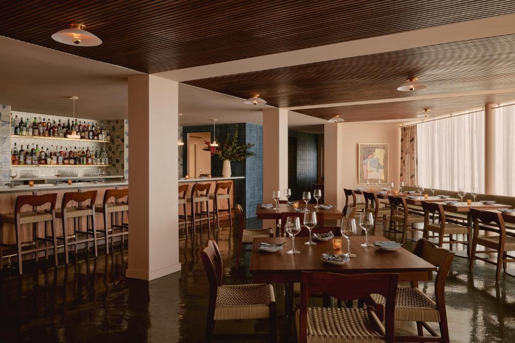 Occupying a prime position just moments from Seawall Boulevard and the Gulf of Mexico, Hotel Lucine transforms a classic 1960s roadside motel into a fresh and stylish coastal retreat. The design preserves the property’s original character while infusing it with mid-century details, locally sourced art and a relaxed, welcoming atmosphere. At the heart of the hotel lies a sociable U-shaped courtyard with a heated outdoor pool, surrounded by a spacious sundeck dotted with loungers and shaded seating.