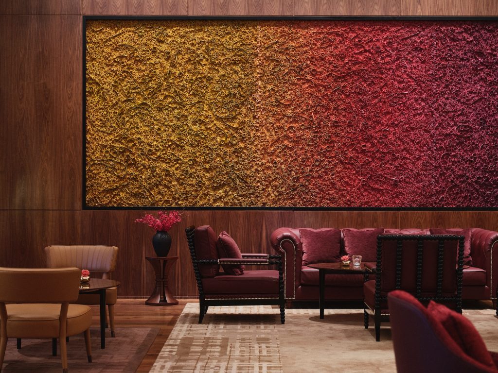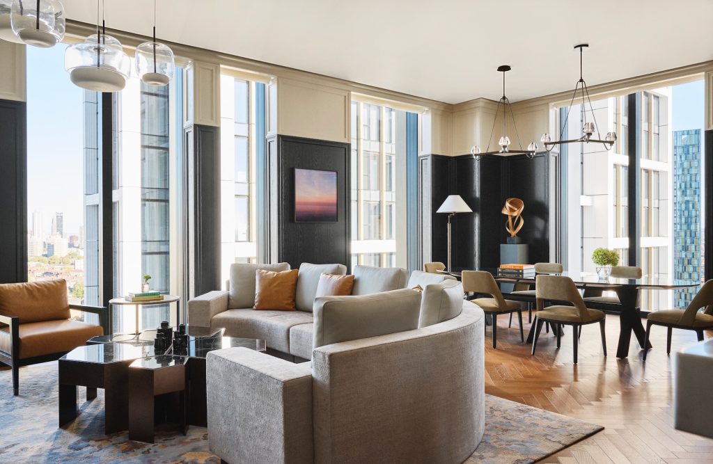 Designed as a modern interpretation of classic English style, interiors feature William Morris-inspired wallcoverings, soft leather and brass accents, and curated artworks by British and international artists including Ian Rayer-Smith and Jo Taylor. The entrance is defined by Charlie Whinney’s sculptural installation Ebb and Flow, evoking the movement of the Thames, while neutral tones and bespoke furnishings bring warmth and serenity throughout.