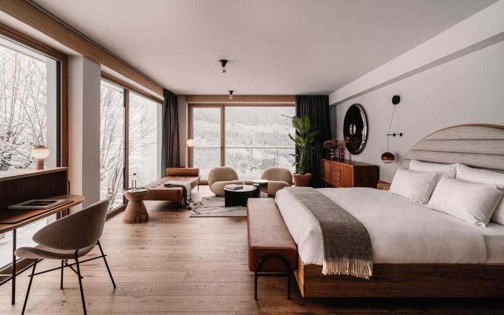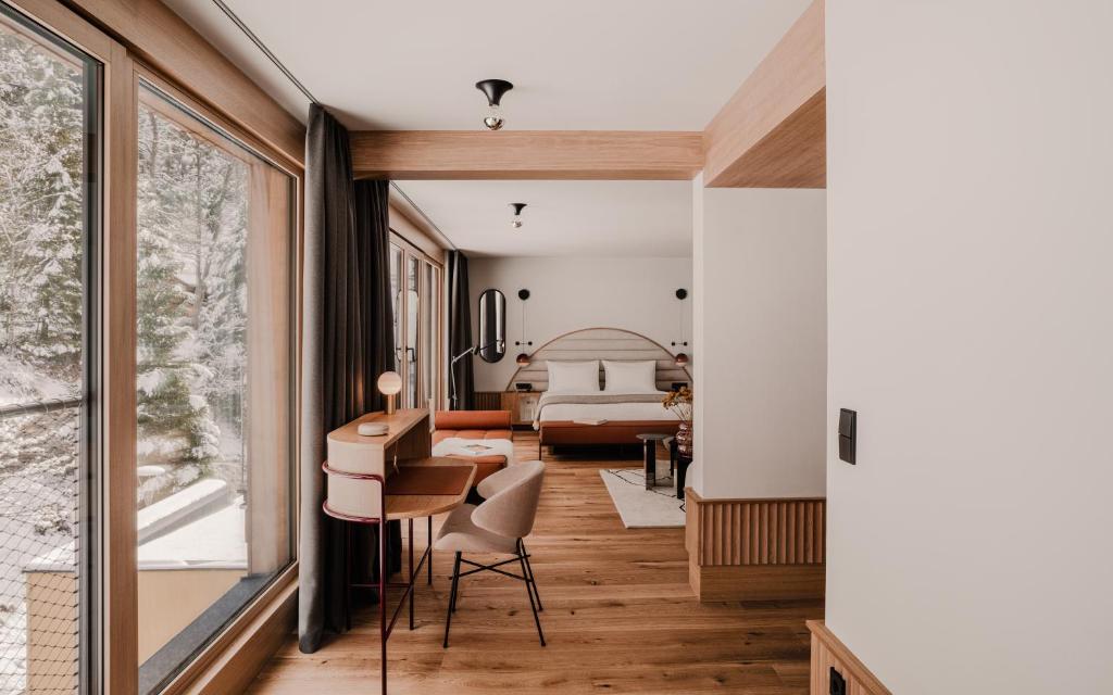 This design hotel offers a modern experience of Bad Gastein; digital nomads are catered for in a co-working space, and there’s an 18-seat cinema, a farm-to-table restaurant and an art gallery for exclusive exhibitions. The Comodo accommodates 70 bedrooms decorated in a minimal urban chic style, complementing the midcentury meets Scandi vibe in the public spaces. Plus it has all the amenities you’d expect from a good hotel in this town; indoor and outdoor pools, a fitness centre, a ski store room, a bar, a library and a spa with saunas and treatment rooms.