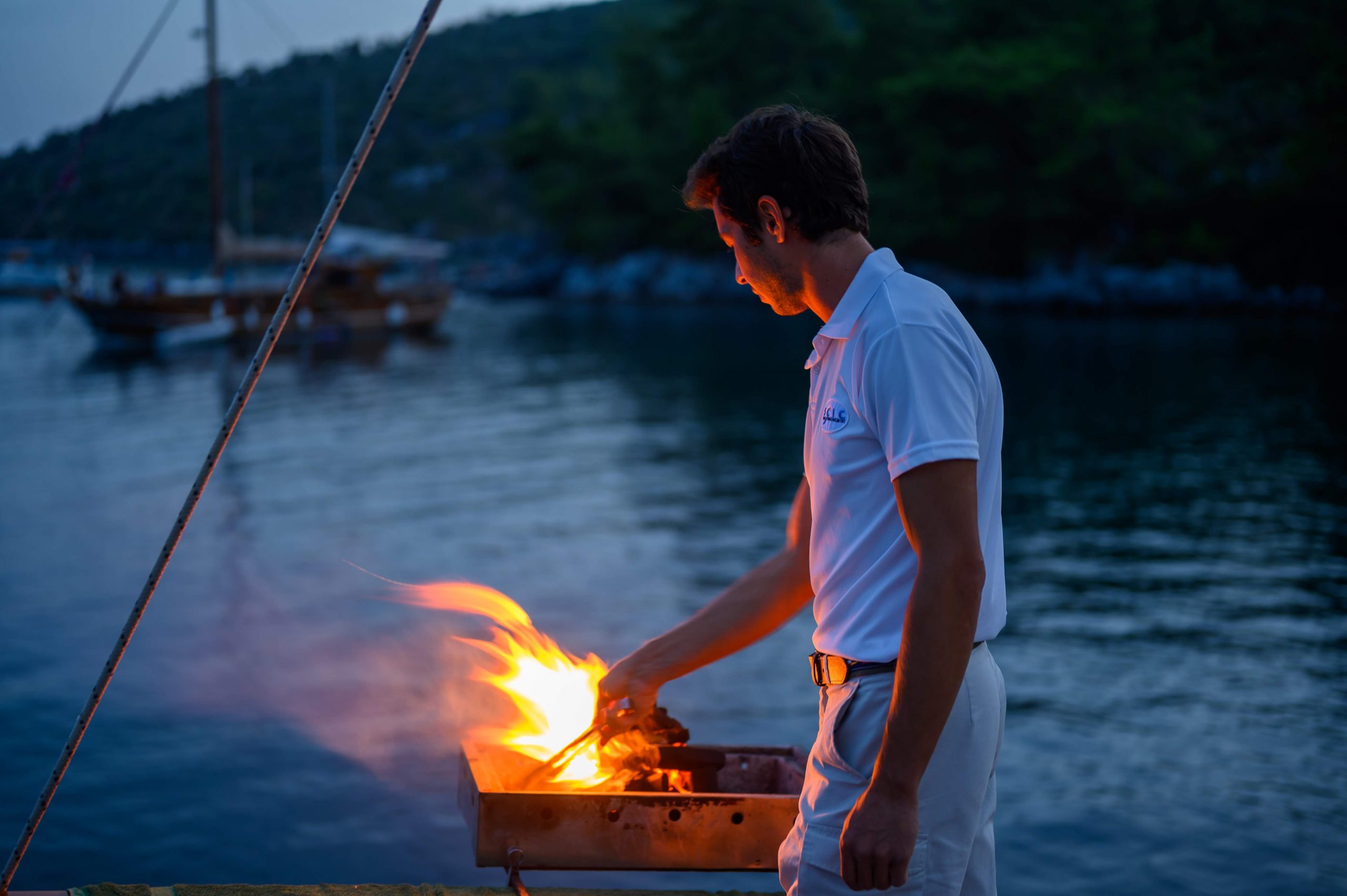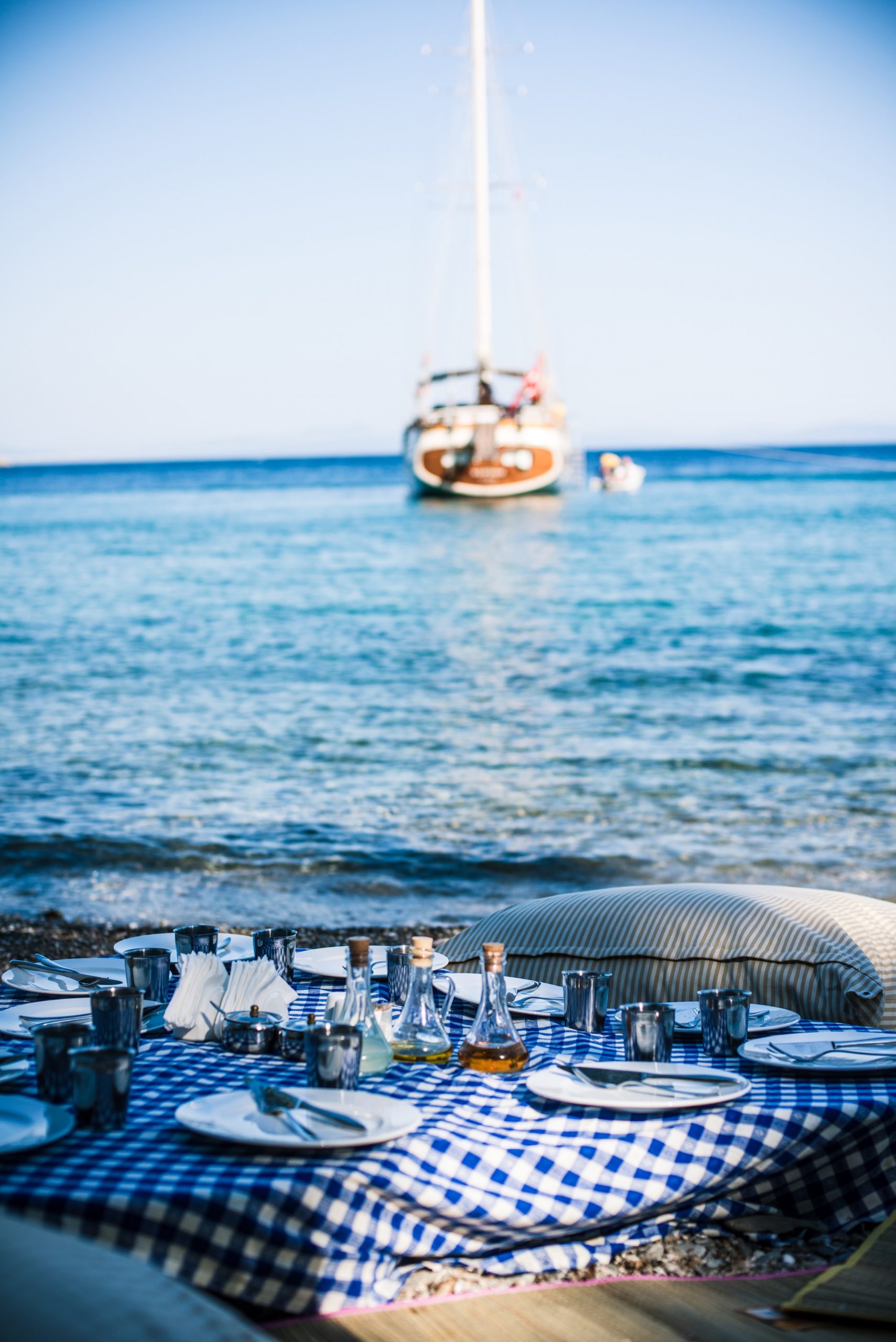 At the water’s edge the captain and his chef will barbecue meat skewers, to be accompanied by freshly prepared Mediterranean dishes of smoked aubergine, white bean humus, Turkish salads, and local cheeses.