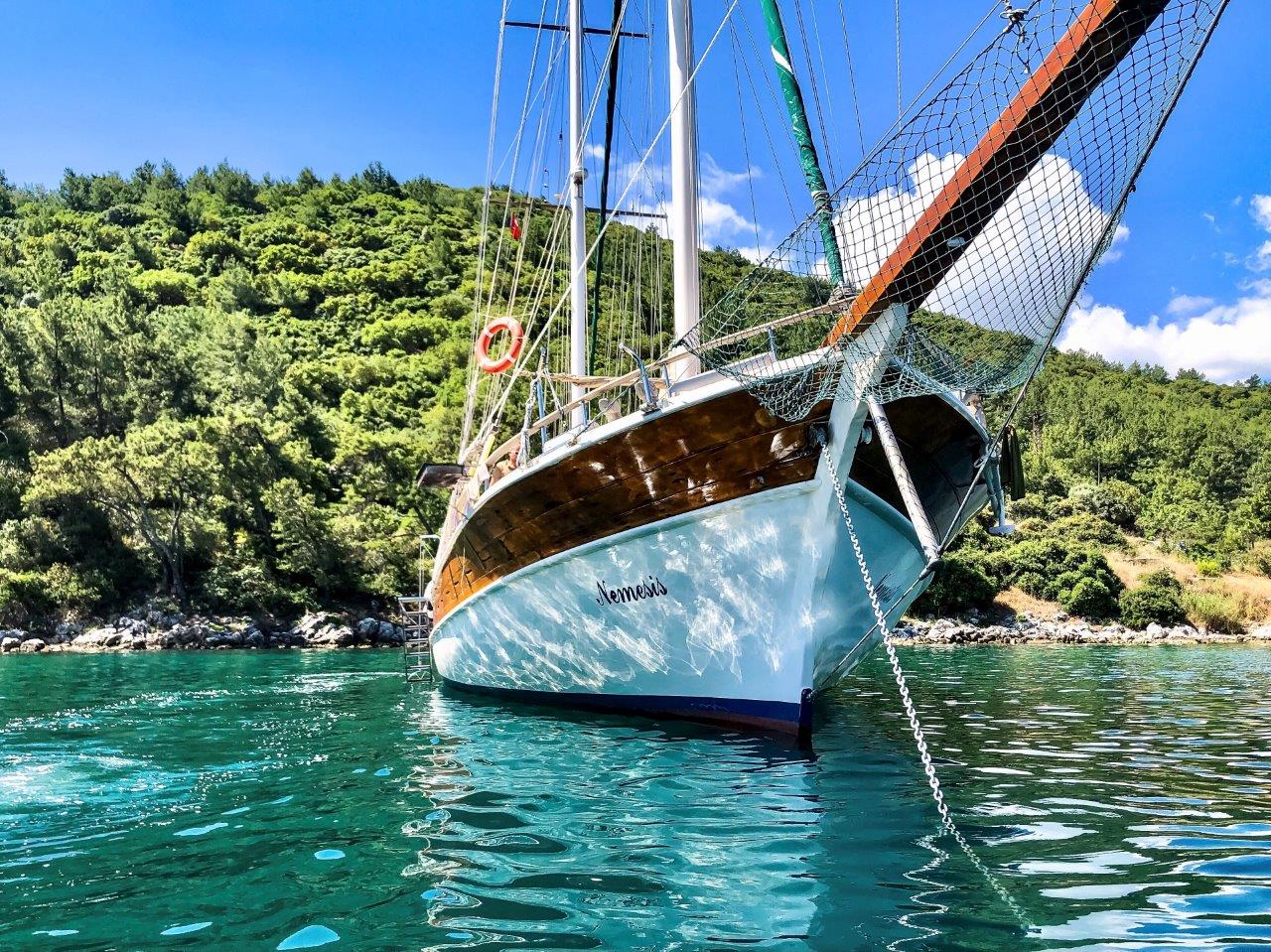 In front of us, shaded by olive, pine and fig trees was a long wooden table, set for an alfresco lunch and laden with a classic Turkish mezze, served in vintage dishes. It was just so quintessentially Mediterranean! In the distance we could make out the dark blue silhouette of a small Greek island, whilst nearby, anchored only a few metres away, was our home for the week, the 28 metre, twin-masted ScicSailing yacht, called ‘Nemesis’.