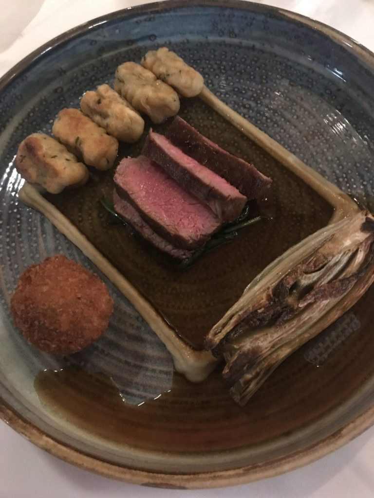The restaurant room itself is very traditional and décor reflects the medieval feel of the castle but the food was highly contemporary and far exceeded expectations. A choice of warm bread was freshly sliced for us before we were presented with a delicious appetizer. In a timely fashion, each course was beautifully presented; we both opted for hand-dived scallops served with glazed pork belly, pickled white grapes and curried cauliflower to start.