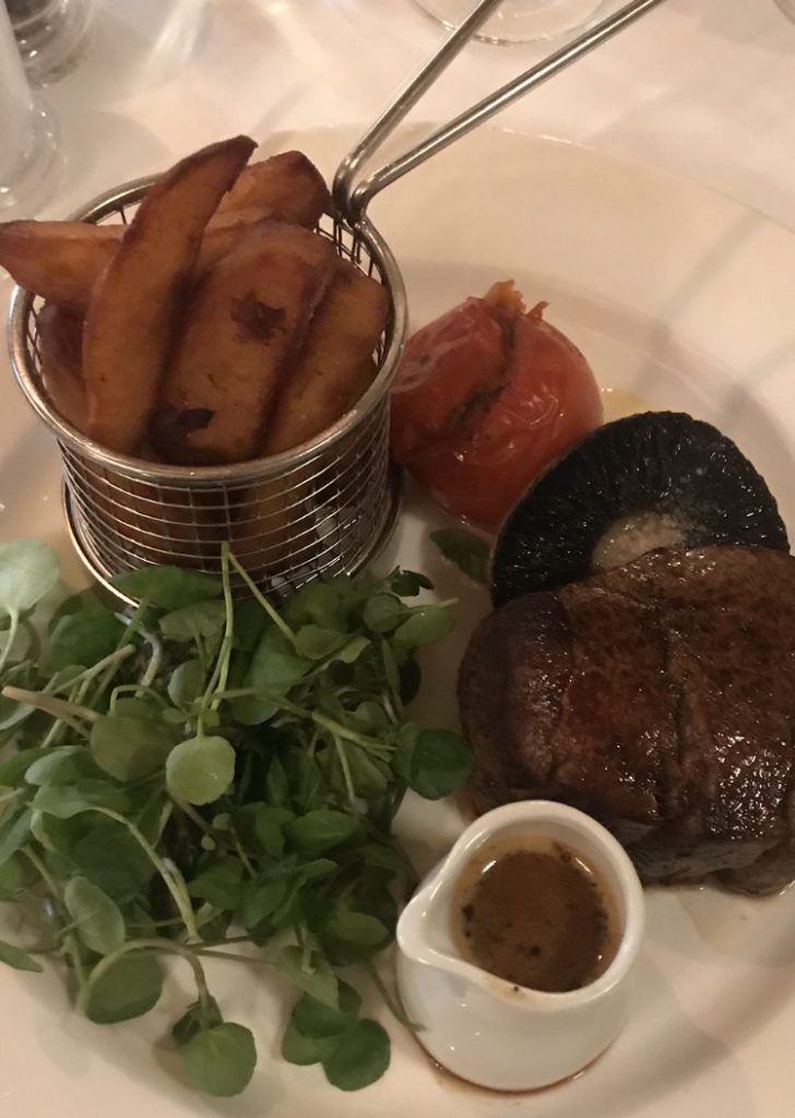 I then chose roast loin of lamb, crisp lamb shoulder served with basil Gnocchi, smoked aubergine puree and roast fennel. The description really doesn’t do the dish justice. It was absolutely delicious and far more adventurous flavours than I expected. My husband chose the 8oz fillet steak which was served with chunky hand cut chips, grilled mushroom, confit tomato and béarnaise sauce – all cooked to perfection and again beautifully presented.