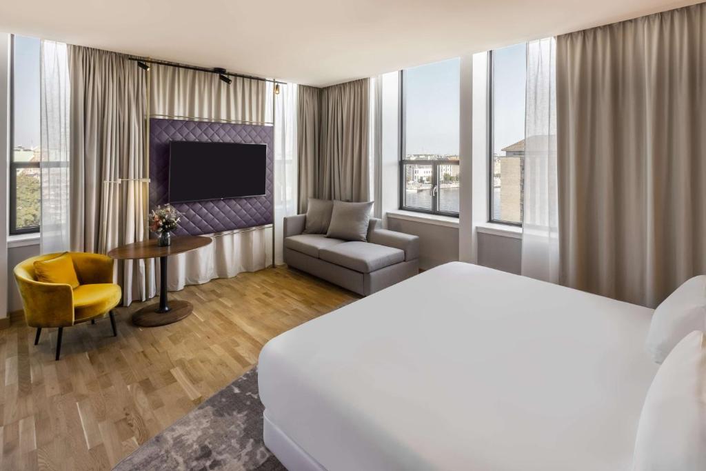(5 stars)Centrally located in the charming Christianhavn neighbourhood, the five-star NH Collection Copenhagen, is the first NH Hotel in Scandinavia. Occupying a unique historical building, overlooking the harbour, the hotel presents 394 rooms and suites, two restaurants, a bar, lounge area and seven flexible rooms for small-to-large-scale meetings of up to 252 people – so appeals to business and leisure guests alike. The chic and calm interior is inspired by the industrial and cosmopolitan atmosphere of the city and its lively harbour. The hotel has a proud focus on sustainability which is evident in the green sedum roof, use of seawater to cool the building, intelligent control of light and indoor climate and choice of sustainable materials.
