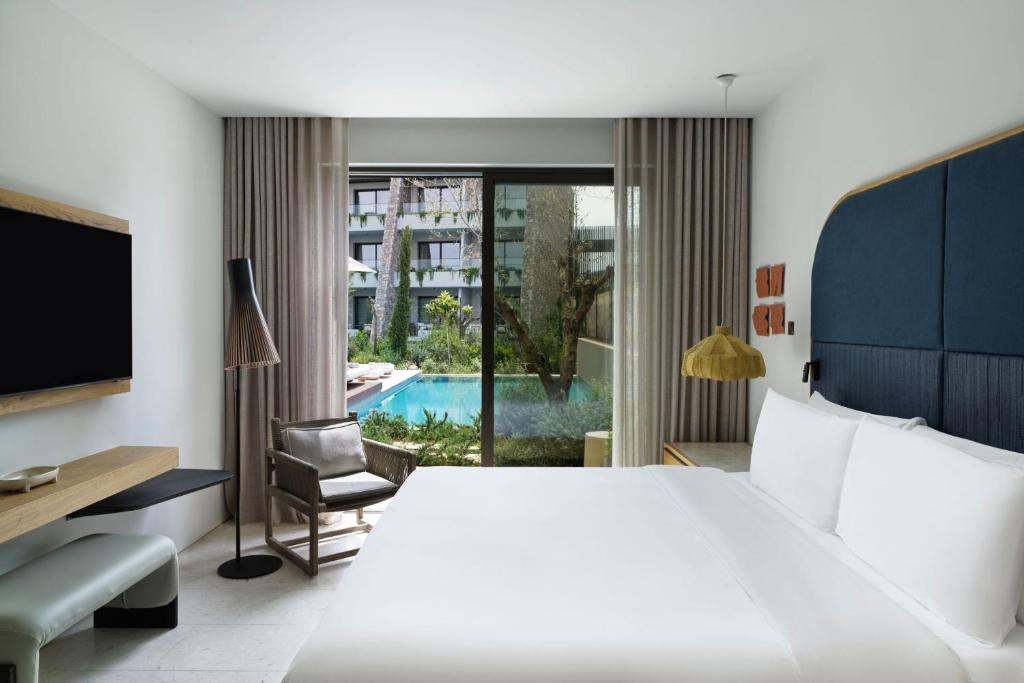 (5 stars)An enormous, sleek pool meanders through the terraces of Summer Senses, but, impressive as it is, it’s just one of 12 pools on the premises. Guests staying here can book treatments at its Anassa Spa by Idolo, go kitesurfing on the adjacent beach and fine dining at two restaurants, Galazia Hytra and Gaia. And the concierge will be happy to arrange yacht charters, car hire, island tours and more. Families are well catered for, with their own shallow lounging pool, kids’ menus, baby supplies and private nannies on hand. All rooms come with a balcony, a Marshall Bluetooth speaker and a Nespresso coffee machine.