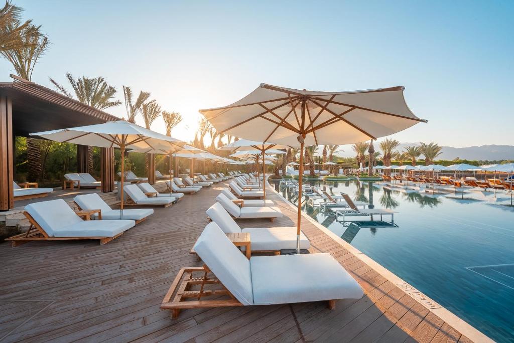 Part of the Ayla complex of amenities (which includes an 18-hole golf course, a wake park, shops and man-made lagoons), the Hyatt Regency is a gleaming white edifice on the horizon. It has four deep blue pools, some built like rivers with bridges over them, complemented by equally blue loungers. At this hotel, you can play pool or ping-pong, sun yourself cocktail in hand at the private beach club, pop to the spa, and dine in its two restaurants (one of which themes food on cuisine from olive oil-producing countries). The kids can hang out in both indoor and outdoor play zones and there’s a rooftop bar for the adults to indulge in a few sundowners.