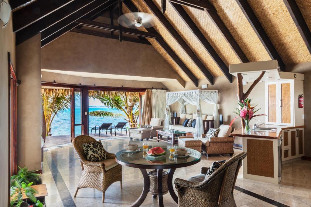 (5 stars)Choose from a villa, bungalow or suite, set beside the Aitutaki’s lagoon, where you can listen to the calming sounds of the lapping shore while you recline on the timber chairs of your private porch. The resort has a colonial-inspired decor in South Pacific rustic-style architecture and is reserved exclusively for adults. Local fare is served all day in the waterside Rapae Bay Restaurant, with snacks and drinks provided on the beach or in-room via the Black Rock Bar. Wellness treatments can also be provided on the beach and in-room, or within the Tiare Spa.