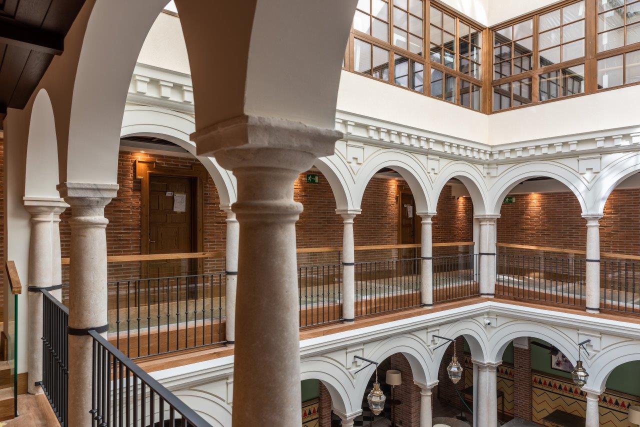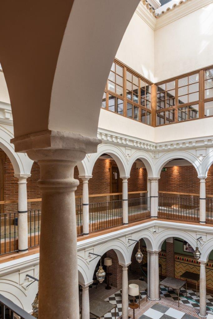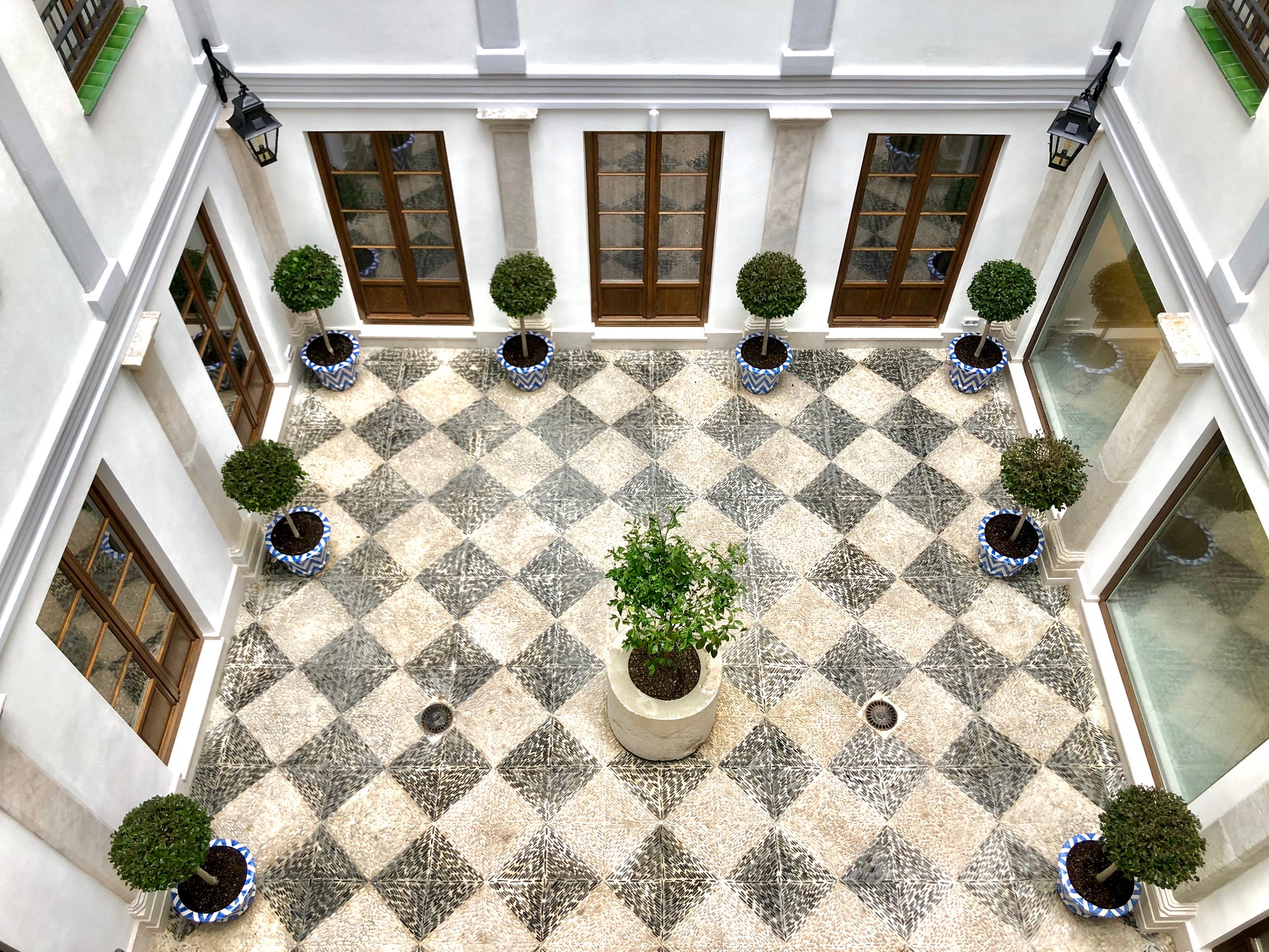 Palacio Solecio is in the historic centre of Malaga, Calle Granada, 61, where the historic 18th century Palace of the Marqués de la Sonora, once stood. The property has maintained the historic facade, restoring the intricate baroque paintwork. In addition, wrought iron elements of the windows and balconies, the grand staircase and some columns from the porticoed courtyard. The interior’s modern reconstruction has been inspired by traditional Andalusian architecture, a balance between Arab and Christian influences from Malaga’s past, integrating exposed brickwork, patterned papers, black and white checkerboard floors, and Al Andalus-inspired lamps.