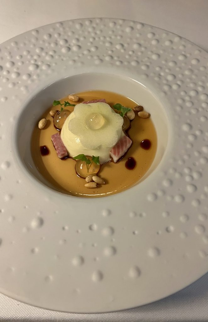 ‘Candlelight’ is as it sounds. However, the candle isn’t made of wax but butter with garlic and specks of parsley. The wick burns, the hard butter melts. It’s served with sourdough full of pine nuts and is all so moreish that we go through two candles. ‘A Sin in a Spoon’ is a small bowl of foie gras decorated with star shaped granny smith apple, muscat gel and elderflower gel. Foie Gras errs more towards the soft than the solid so a spoon is definitely in order for a sloppy and extravagant mix. ‘A Clash of temperatures’ consists of raw Algarve prawns, more caviar, grapefruit and orange segments, all of which are covered in a warm leek foam at the table for an exercise in contrasts.