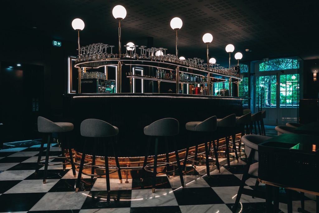 A large glowing sign with the restaurant’s name guides guests down a narrow side alley where a multitude of strategically placed lanterns achieve a pin-prick aesthetic and suggest drama lurks nearby. Part of the Torel Palace Porto, guests avoid the hotel’s formal entrance but, after the alley, pass by a compact and glowing azure hotel pool and a few drinks tables above which two chandeliers hang. An unassuming doorway on the left opens into the monochromatic Blind, which, chequered floor aside, is more black than white. The sight of a horseshoe bar around which no chairs are placed, no punters stand and no drinks are served is surreal, and what appears to be a contemporary art series hanging from the walls offers, in fact, a spelling of ‘sensation’ in Braille.