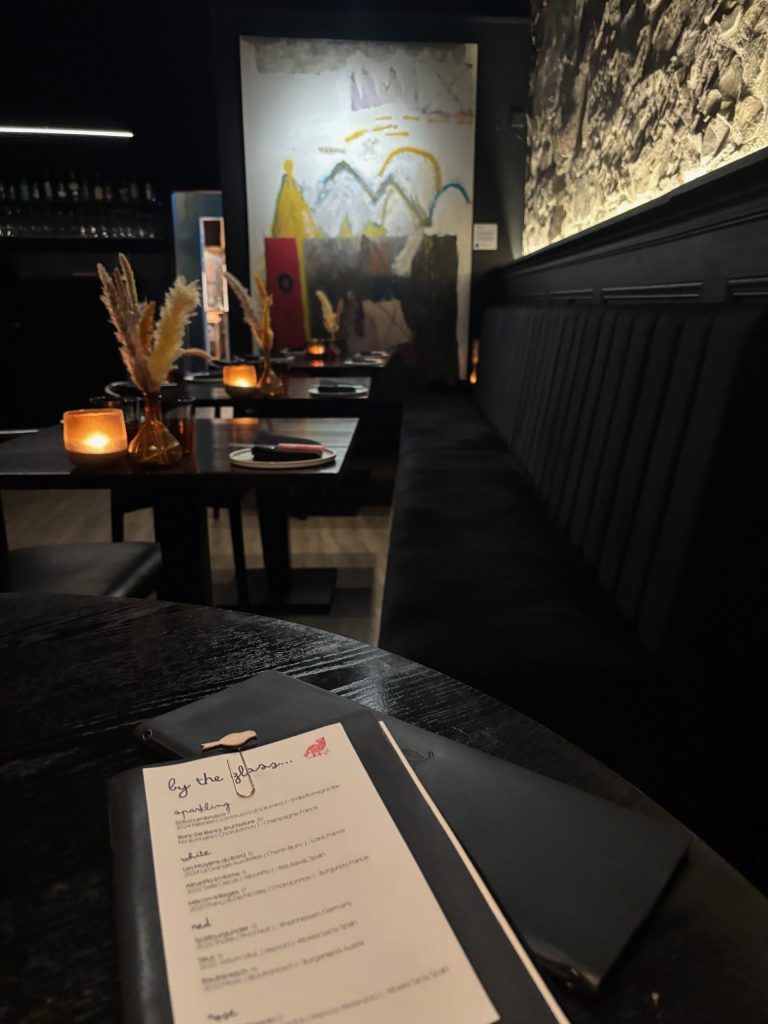 The restaurant is intimate with just 24 covers and makes use of its space well, tables stand at a respectable distance apart (avoiding the dare-not-speak diner scenario) and are set with minimalistic cutlery, a trio of feathers form the centre piece which are illuminated by the amber glow from the tumbler-style table candle. The background music is of an Ibiza-chill genre. Dark wood tables, chairs and black banquette seating are complimented by bursts of vibrant colour from the artwork adorning the exposed stone walls. The vibe is understated cool. I immediately like this place.
