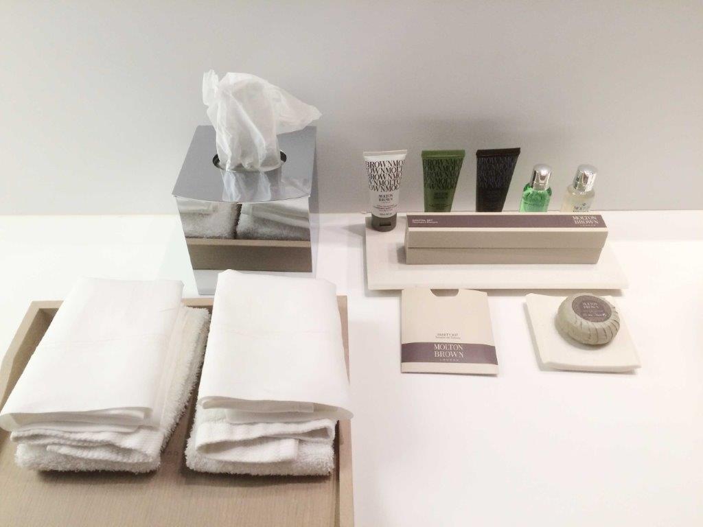 The contemporary, all-white bathroom featured a large, half egg bath tub, designer lighting and plenty of Molton Brown amenities, including luscious smelling body products, a small loafer, hair brush etc. Other thoughtful details included a single cut rose in a vase, linen face towels, effervescent bath-bomb and room fragrance.