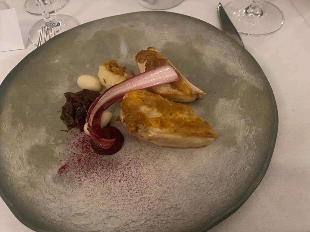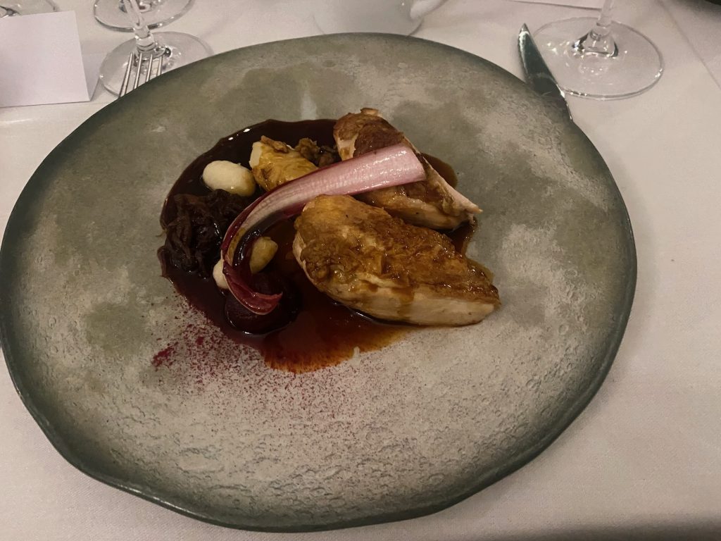 Warm sourdough with butter is followed before the first of the more structured pairings of salt-baked beetroot served with goat’s curd and pumpkin seeds, accompanied by a crisp Sauvignon Blanc. The wine’s lively acidity and citrus notes cut cleanly through the earthy sweetness of the beetroot, lifting the dish with precision and clarity. As the menu progressed, the wines deepened in character. A mineral-driven Albariño, with its saline edge and gentle stone-fruit notes, worked in perfect harmony with the grilled Cornish mackerel, amplifying both the richness of the fish and the brightness of lime and dukkah. The transition to the honey-glazed duck breast brought a shift to red – a supple Carignan, layered with dark berries and subtle spice, which echoed the depth of the dish while balancing the bitterness of chicory and the softness of gnocchi and celeriac.