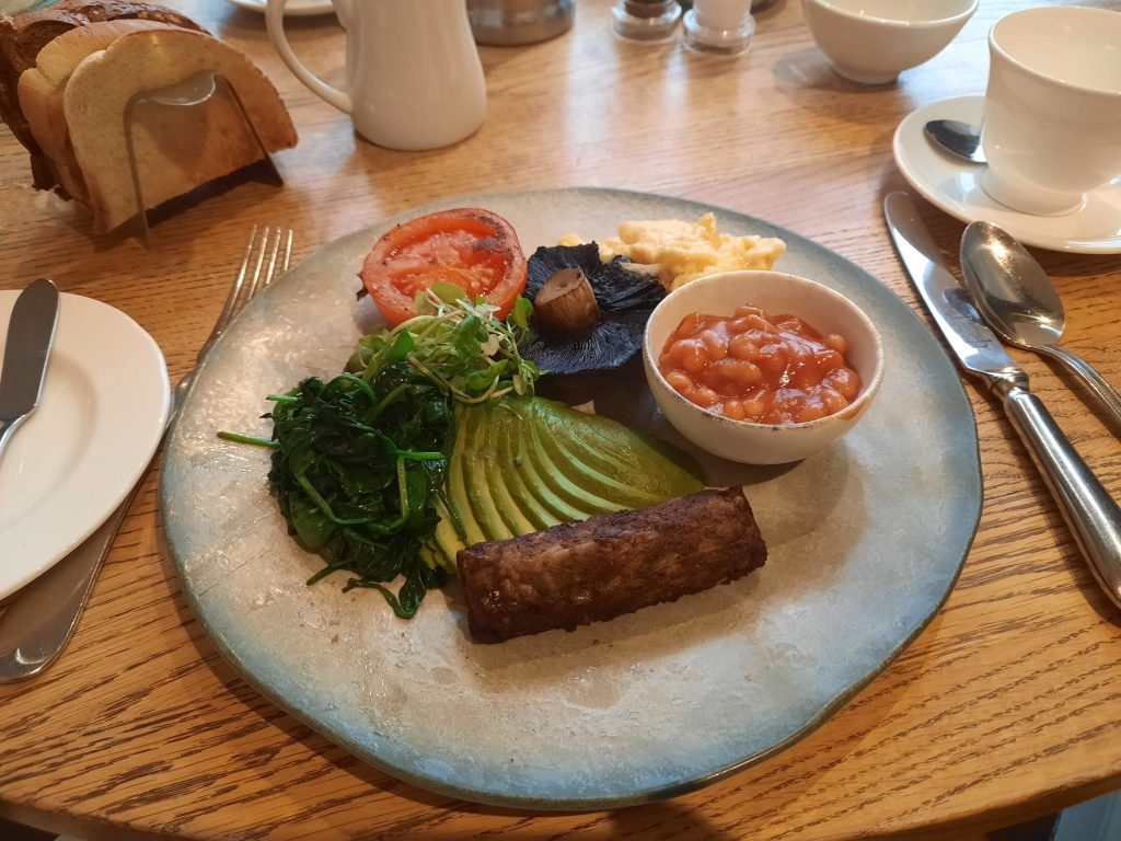 The following day, the vegetarian cooked breakfast proved equally good. Avocado was fanned with precision across the plate, accompanied by a perfectly grilled tomato half, a richly flavoured field mushroom, wilted spinach and baked beans served neatly on the side, alongside a well-cooked vegetarian sausage and the same luxuriously soft scrambled eggs. Once again, it was a plate that delighted as much in presentation as in flavour – each element distinct, harmonious and executed with care. On both mornings, I chose to finish with toast, butter and thick-cut marmalade, and a pot of English breakfast tea: traditional, comforting and somehow entirely fitting. Just as it would have done at my imaginary 1920s country house weekend away.
