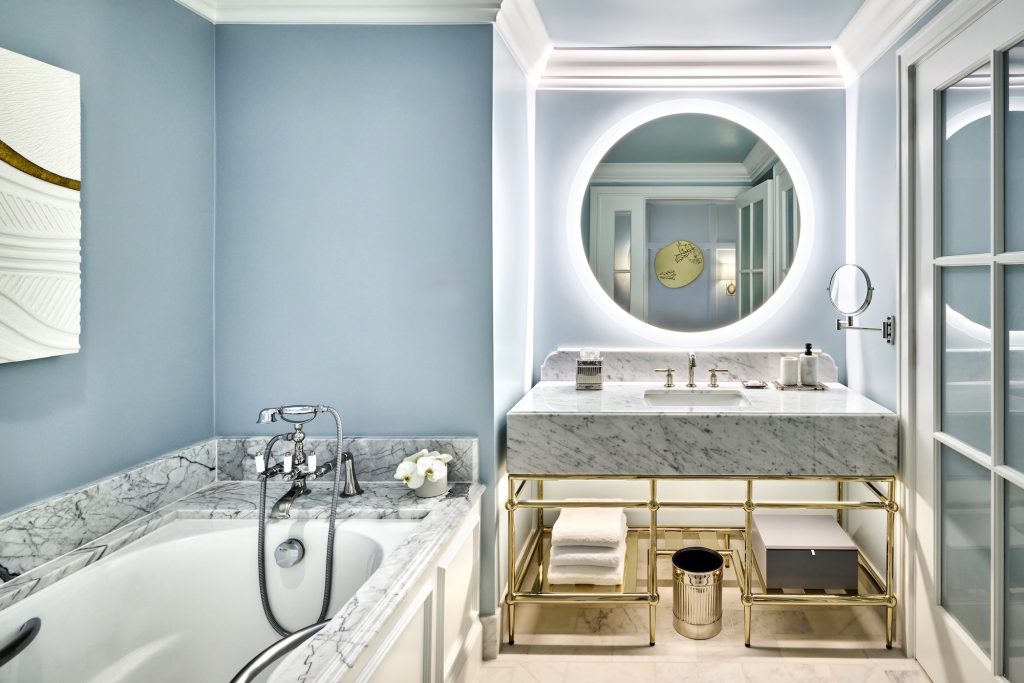 My room functioned as both retreat and observation post, with a north-facing picture window that overlooked the coastline’s crashing waves and the golf course. A large television anchored the room, and the bedding was plush, making for cozy early nights and slow mornings. A Nespresso machine handled coffee, and complimentary soft drinks in my private bar were refreshed daily, a small and welcomed indulgence. The marble bathroom included a deep soaking tub, Dyptique bath amenities, and straightforward comforts such as robe and slippers.