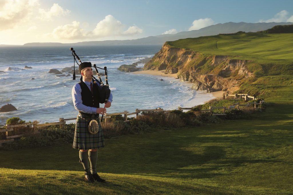 The resort’s Highland character reveals itself most convincingly in the details. Each evening at sunset, a lone bagpiper makes his way from the entrance toward the Ocean Lawn, the sound carrying across the cliffs as daylight fades. It’s a beloved ritual. Bell staff dressed in jodhpurs and flat caps reinforce the mood, as does the hotel’s own bespoke tartan, designed exclusively for the property and officially registered with The Scottish Register of Tartans. Its palette draws directly from the surroundings, blending the deep blue of the Pacific, the vivid green of the Half Moon Bay Golf Links, and the rich, earthy tones of nearby redwood forests. Weather, too, plays a defining role here. Fog is embraced as part of the experience, lending an atmospheric quality that many seasoned guests prefer, particularly when paired with one of the resort’s many fire pits. Scattered throughout the grounds, these fires become natural gathering points as evening settles in, offering warmth, conversation, and uninterrupted views of the restless sea below.