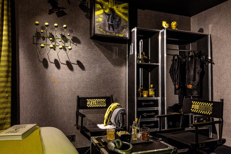 Following the acid yellow there, the director’s chairs are printed with customised graphic hashtags evoking English music subcultures such as punk, indie rock and ska. Individually designed beds, mobile wardrobes and occasional furniture are made with flight-case materials, lending an edgy urban nomad feel to the room as if the set has just been unloaded from the trailer or private jet of a DJ or band on a world tour.